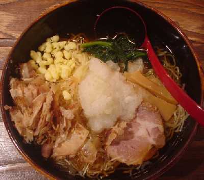 そばつゆのような鰹ダシの効いたマイルドな醤油味のさっぱりしたスープ。麺は冷麦のような柔らかな食感の細ストレート麺。具には大根おろし、鰹節、揚げ天玉、チャーシュー、メンマ、青菜。大根おろしのさっぱり感と揚げ玉のカリッとした歯ざわりがアクセントになっていて美味しいです。 |