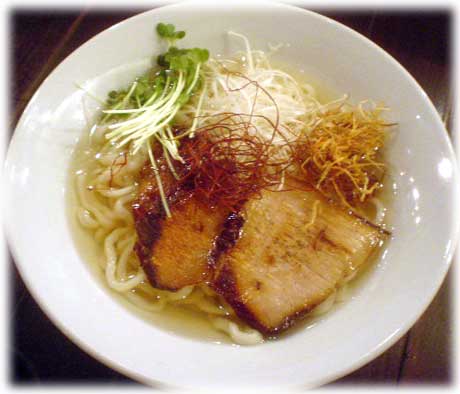 冷たく冷やされたっぷり入った透き通ったスープはふくよかな鶏のダシの風味とシソの香りが清涼感を醸し出しています。細縮れ麺は水で締めてちりちりっとした歯切れの良い食感になっています。温かいチャーシュー入りスープが別の容器で出てきてチャーシューの脂分が固まるのを防ぎ柔らかなまま食べられます。